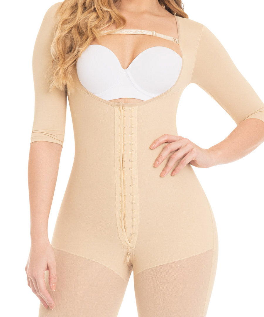 Esta Faja larga con cobertura en espalda y brazos F0074 de Fajas M&D® ofrece excelente compresión, protección diaria y posquirúrgica.